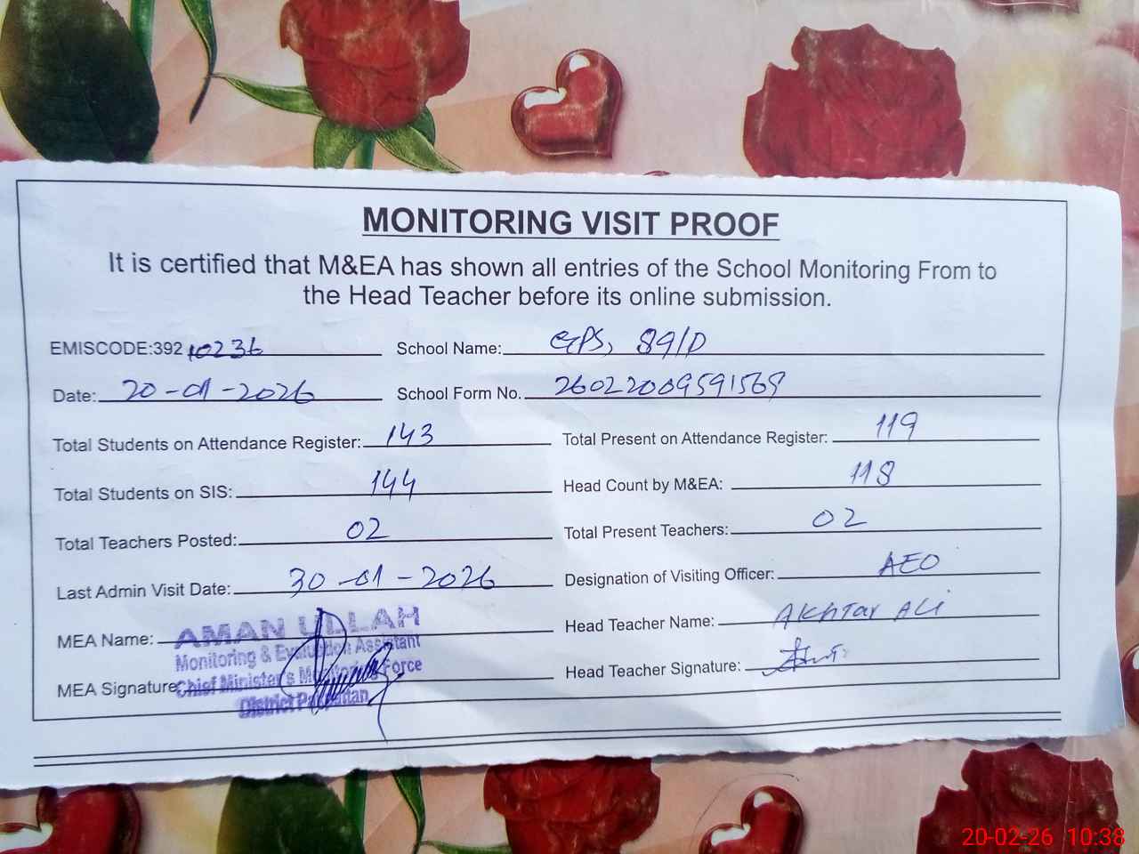 | Attendance Register | Head Teacher | MEA with School | Visit Proof |