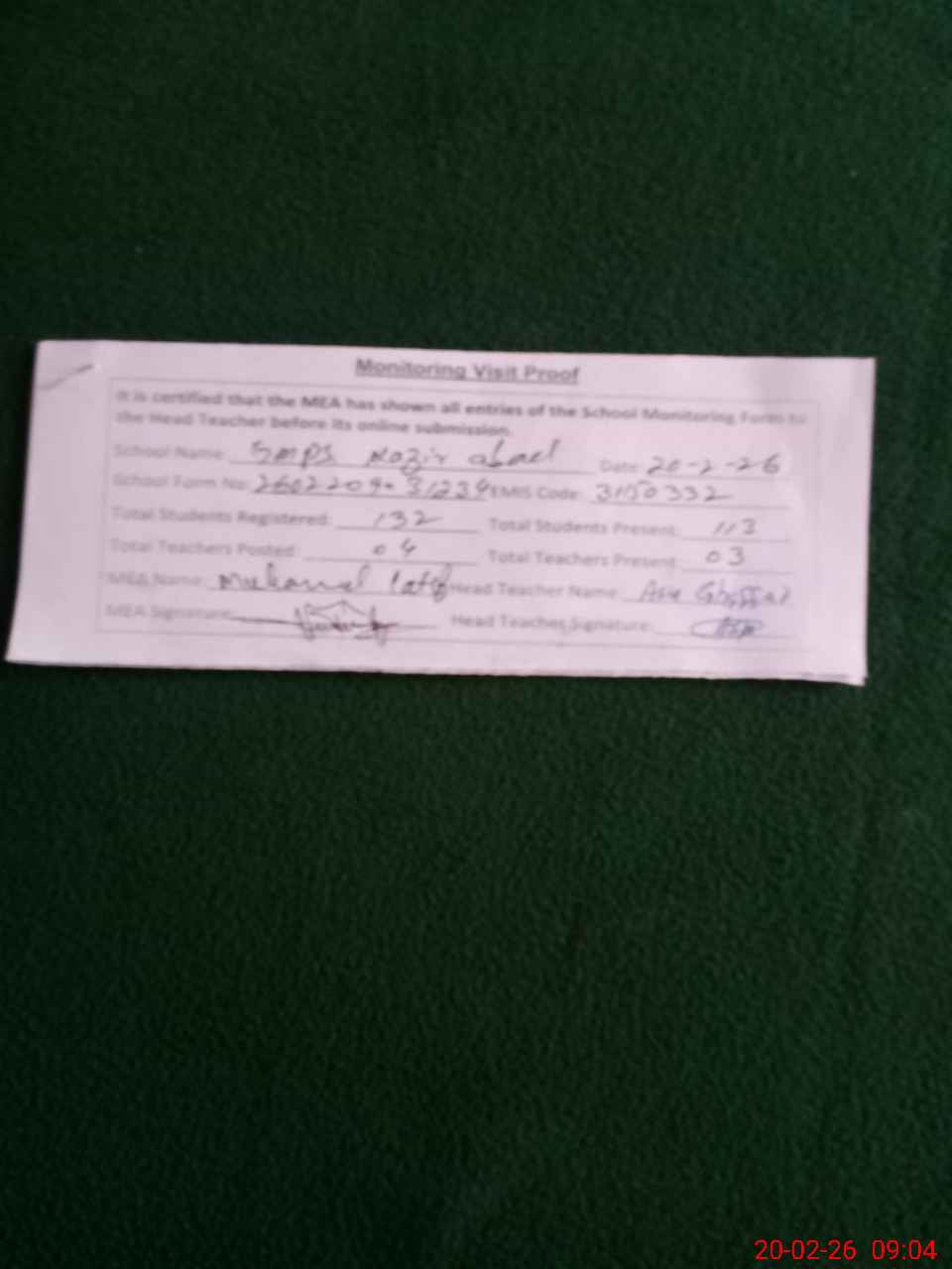 | Attendance Register | Head Teacher | MEA with School | Visit Proof |