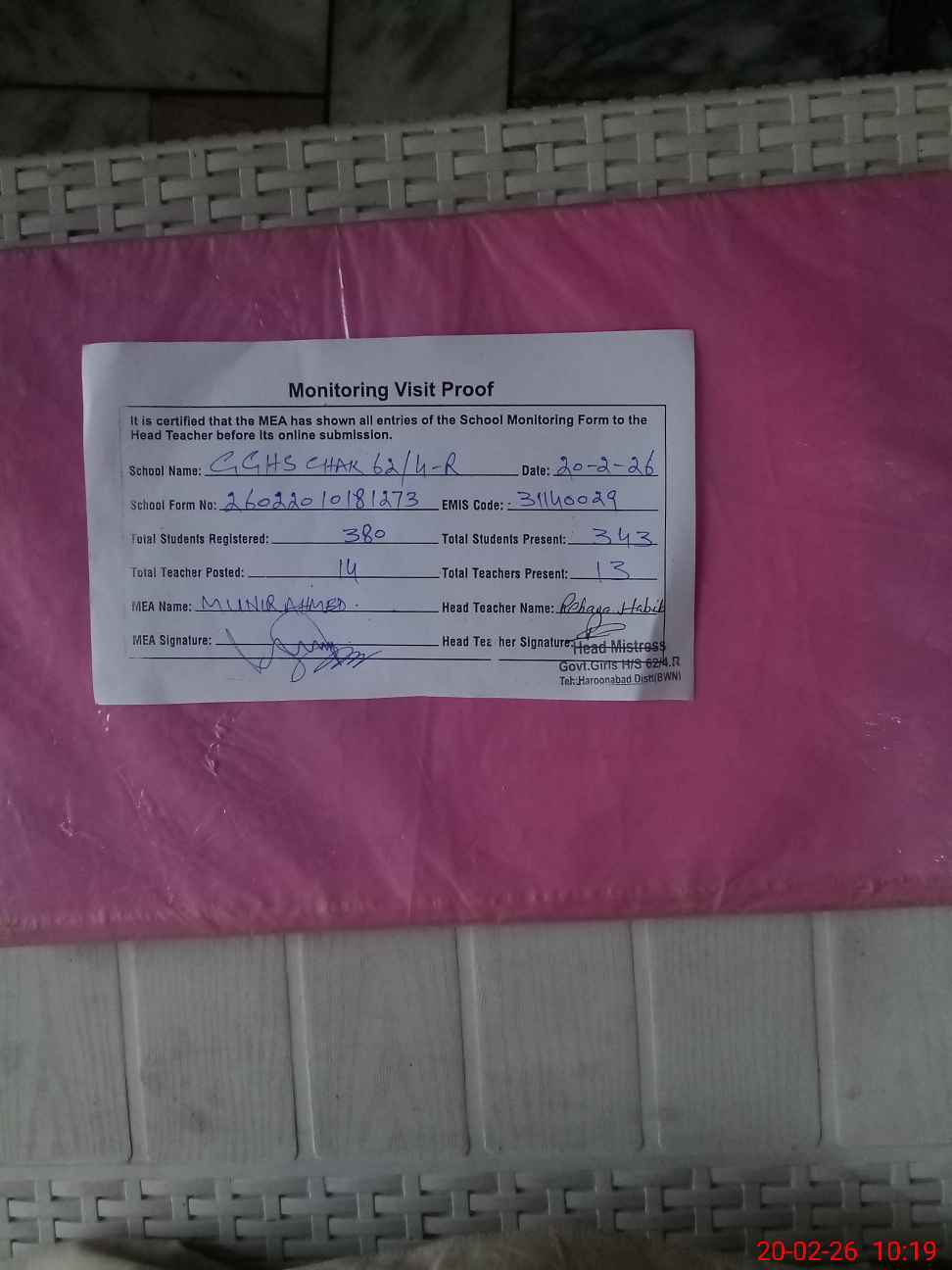 | EMIS Code: 31140029 | Name of School: GGHS CHAK NO.62/4-R | |||