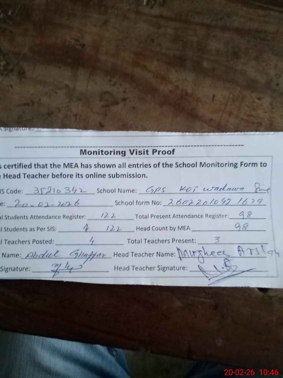 | Attendance Register | Head Teacher | MEA with School | Visit Proof |