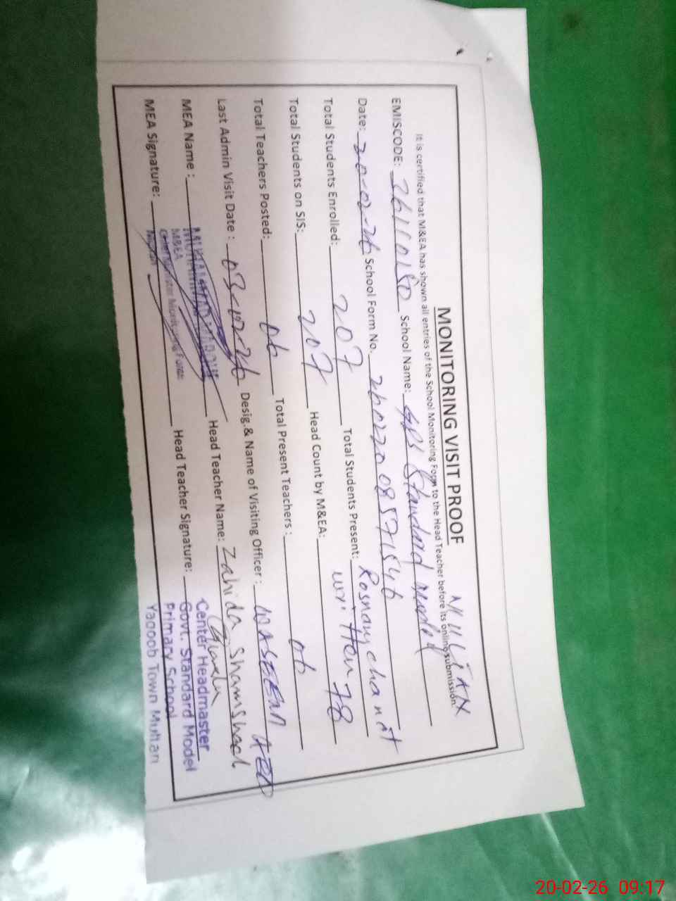 | Attendance Register | Head Teacher | MEA with School | Visit Proof |