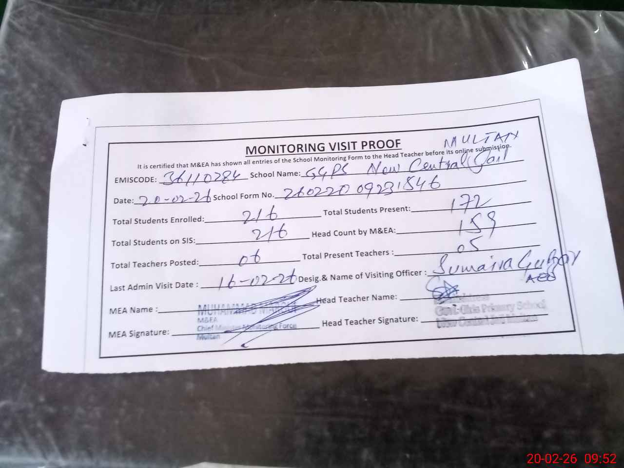 | EMIS Code: 36110284 | Name of School: GGPS NEW CENTRAL JAIL MULTAN | |||