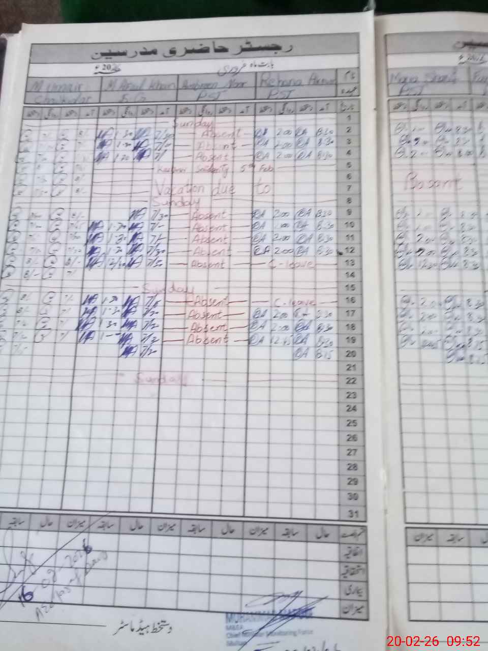 | Remarks (Use Separate Page if Required): PST Ambreen Noor absent since 19th Jan 25 02 rooms wrecked need to be rebuilt western side boundary wall need maintenance | |||||