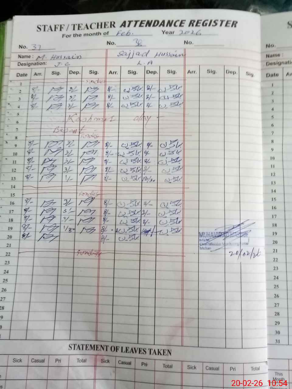 | Monitoring Date: 20-02-2026 | Start Time: 20-02-2026 09:56 AM | End Time: 20-02-2026 10:55 AM | Name of MEA: Mu**** Ma**** | |