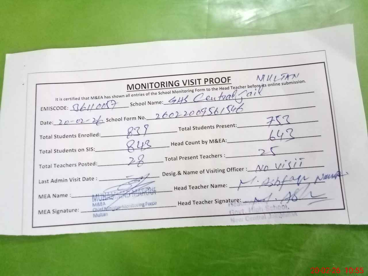 | Certified that this School was Inspected by the Undersigned MEA/DMO Today and the Information Stated Above is as Per Record. | |||||