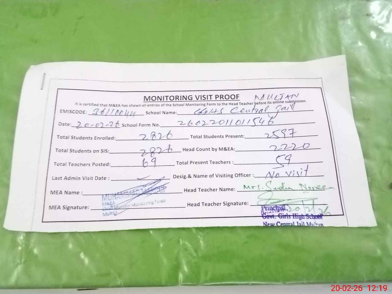 | EMIS Code: 36110044 | Name of School: GGHS NEW CENTRAL JAIL MULTAN | |||