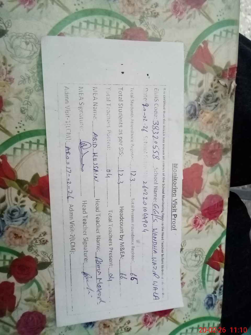 | Attendance Register | Head Teacher | MEA with School | Visit Proof |