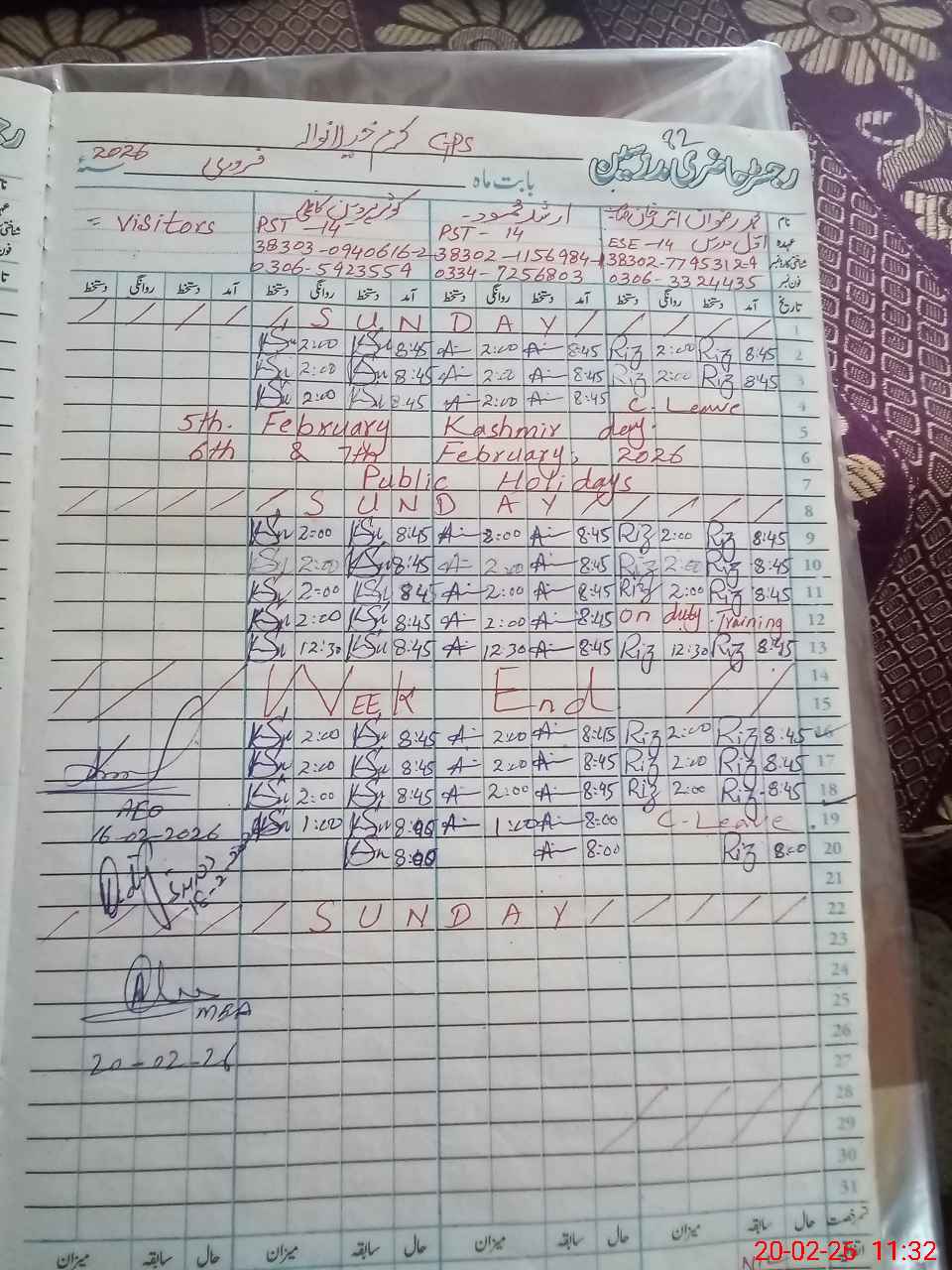 | Monitoring Date: 20-02-2026 | Start Time: 20-02-2026 11:25 AM | End Time: 20-02-2026 12:05 PM | Name of MEA: Ab**** Hu**** | |