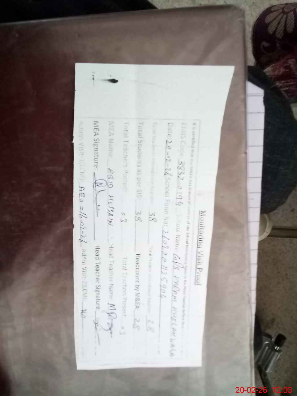 | Attendance Register | Head Teacher | MEA with School | Visit Proof |