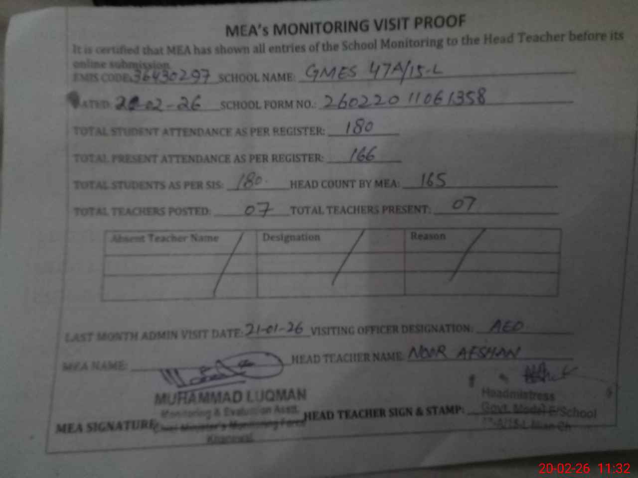 | Monitoring Date: 20-02-2026 | Start Time: 20-02-2026 10:56 AM | End Time: 20-02-2026 11:32 AM | Name of MEA: Mu**** Lu**** | |