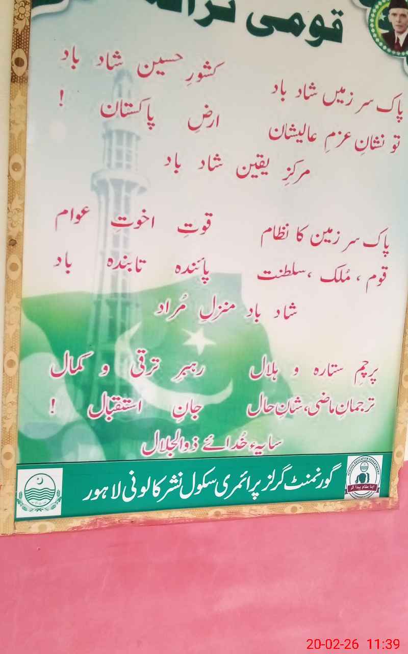 | District: LAHORE | Tehsil: MODEL TOWN | Markaz: NISHTER-FEMALE | Level: Primary | |