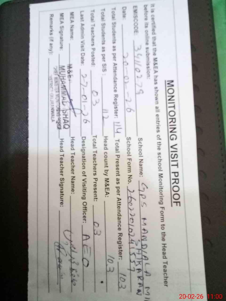 | Attendance Register | Head Teacher | MEA with School | Visit Proof |