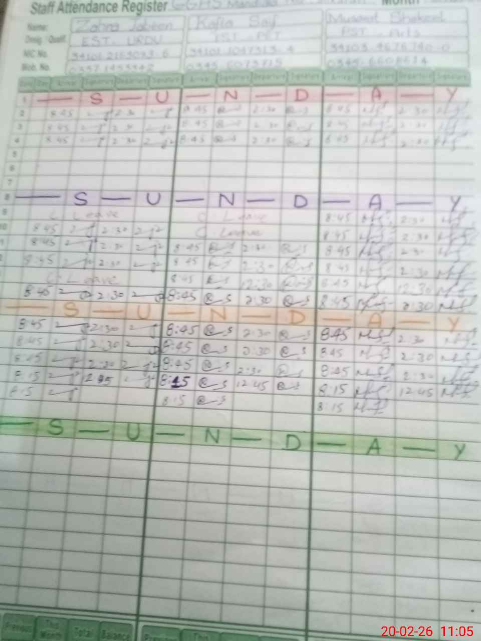 | CNIC | Full Name | Designation | R/C | Absence During Last Calender Month |