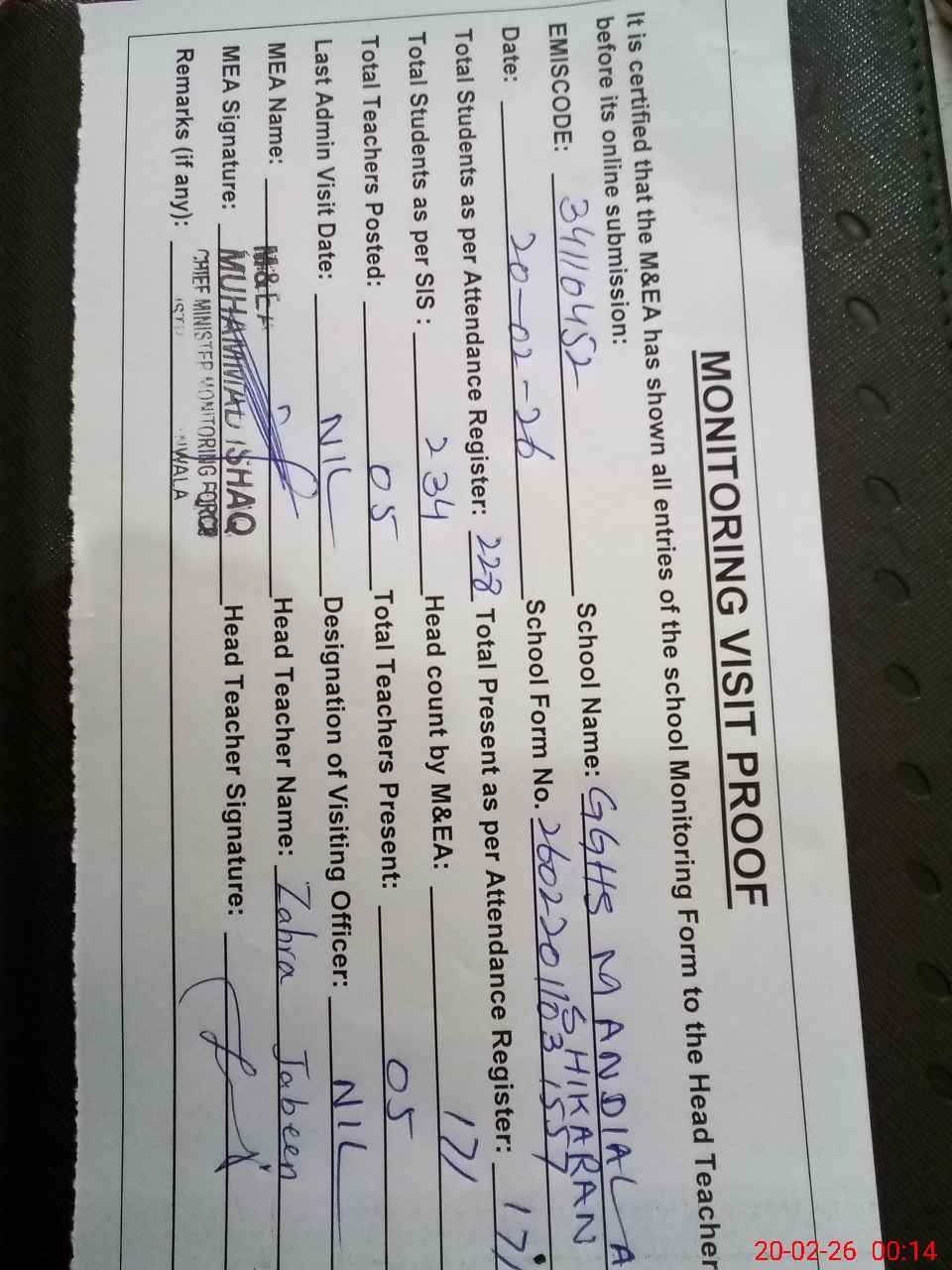 | Attendance Register | Head Teacher | MEA with School | Visit Proof |