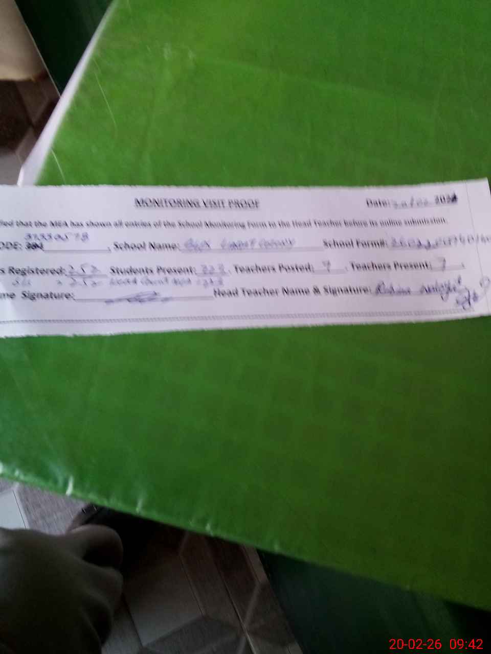 | Attendance Register | Head Teacher | MEA with School | Visit Proof |