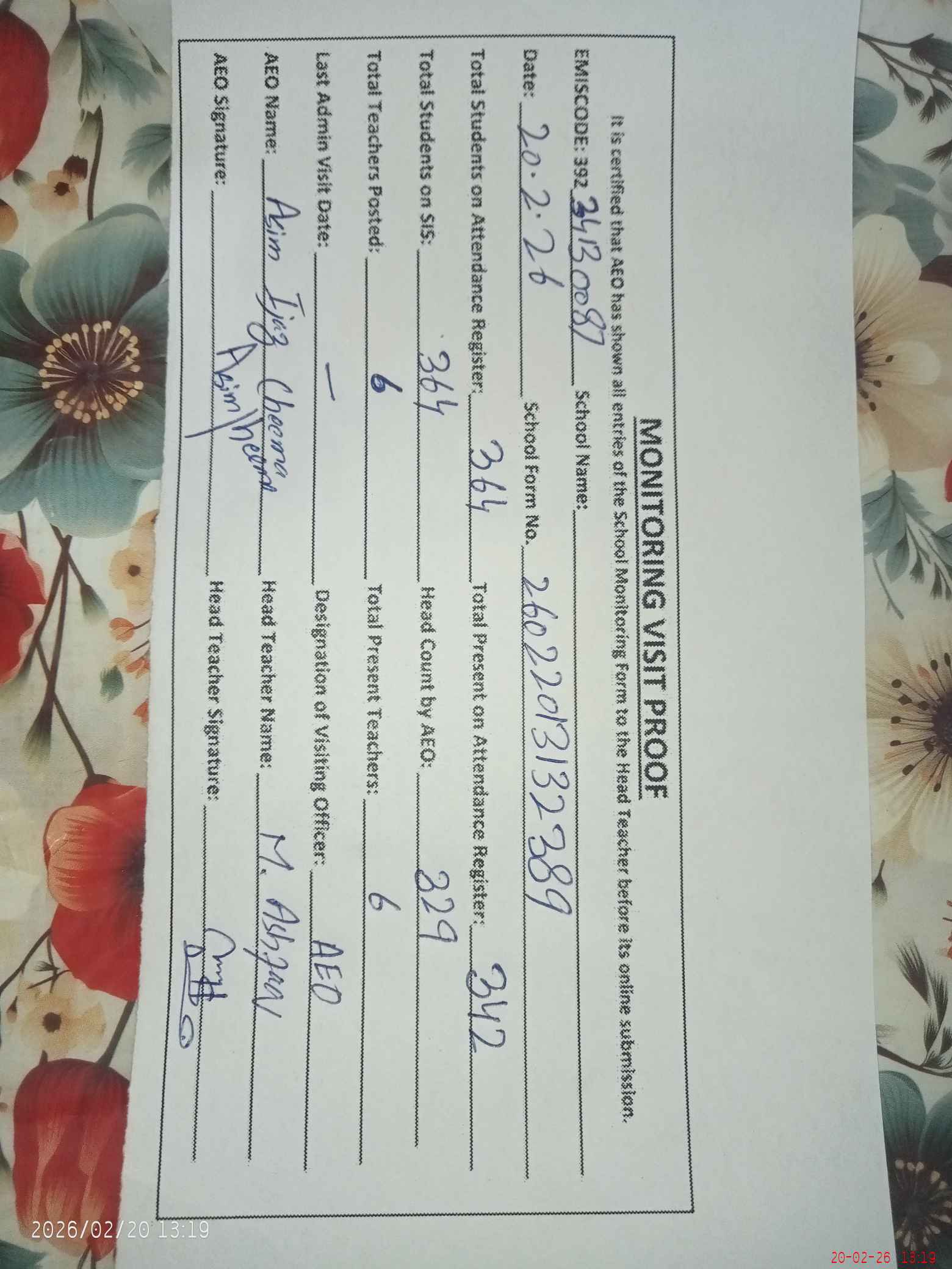 | Certified that this School was Inspected by the Undersigned MEA/DMO Today and the Information Stated Above is as Per Record. | |||||