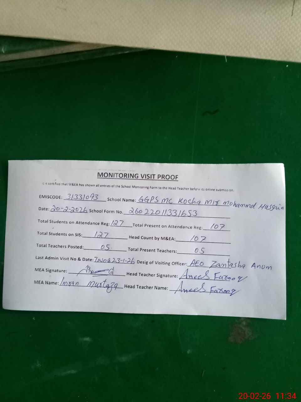 | Attendance Register | Head Teacher | MEA with School | Visit Proof |