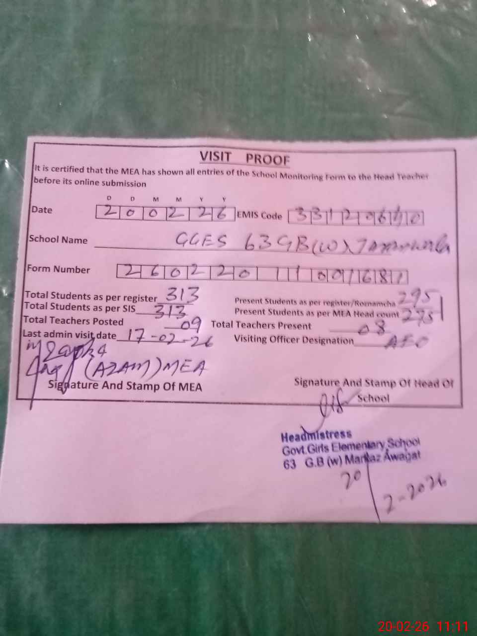 | EMIS Code: 33120640 | Name of School: GGES CHAK NO 63 GB W | |||