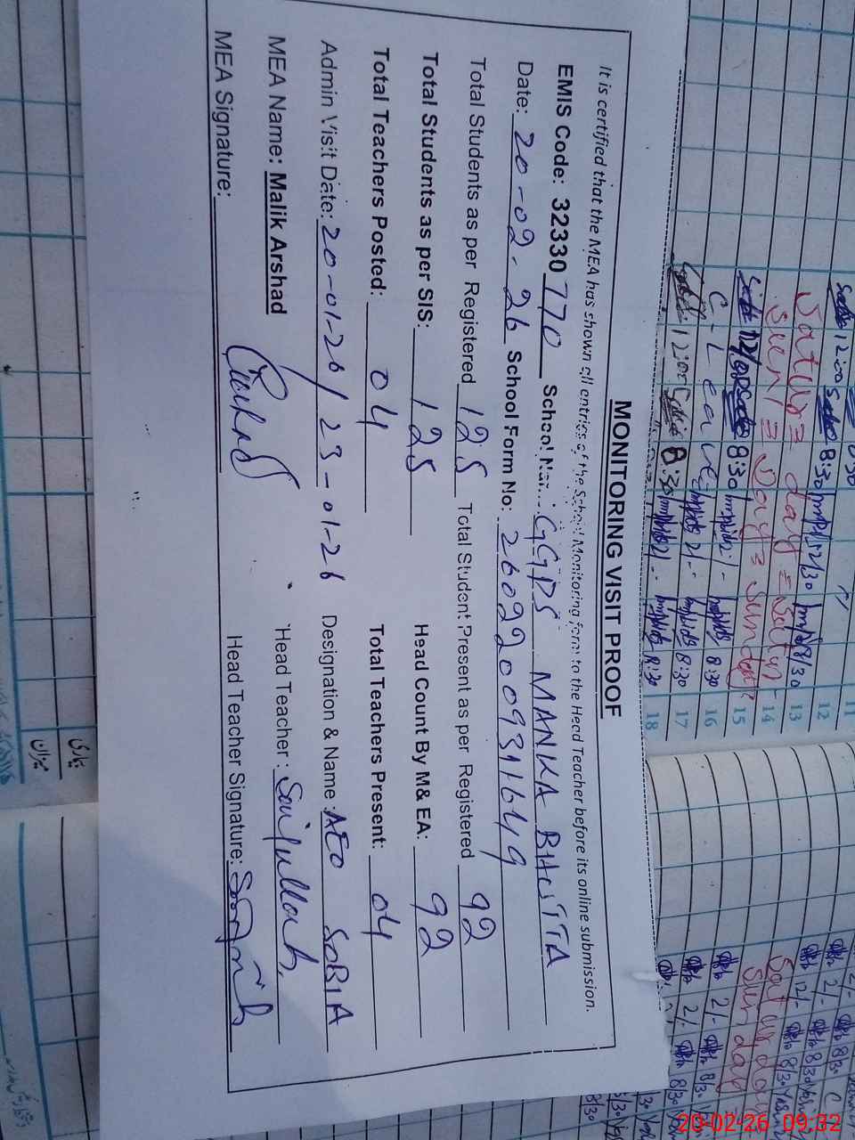 | Attendance Register | Head Teacher | MEA with School | Visit Proof |