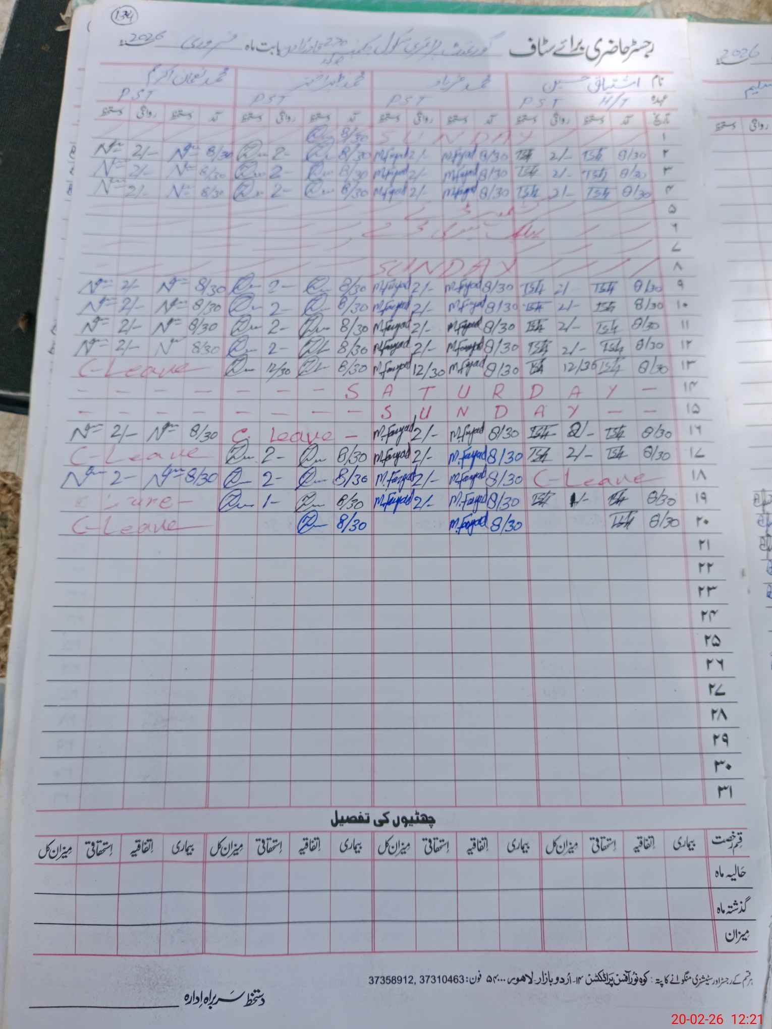 | CNIC | Full Name | Designation | R/C | Absence During Last Calender Month |