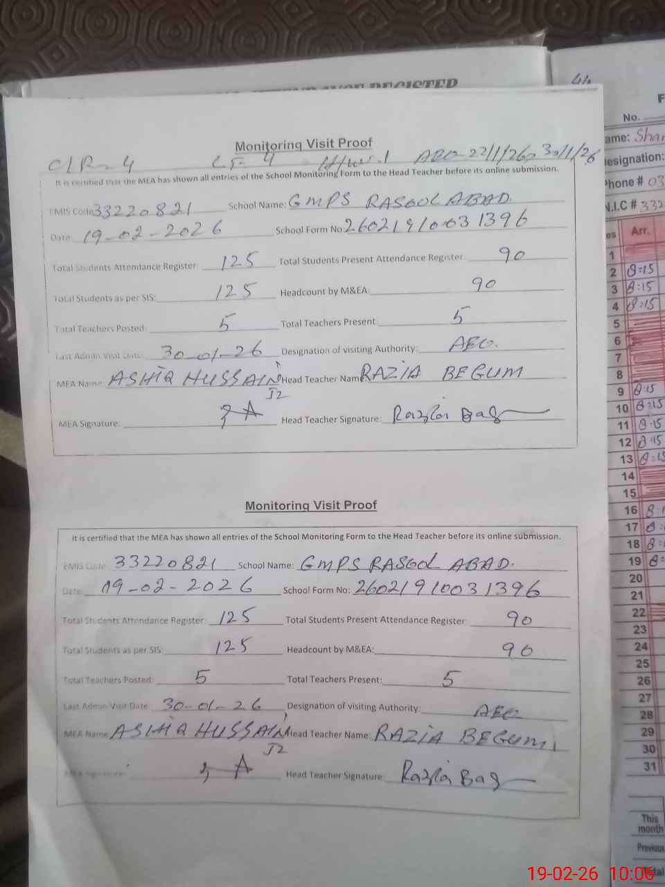 | Attendance Register | Head Teacher | MEA with School | Visit Proof |