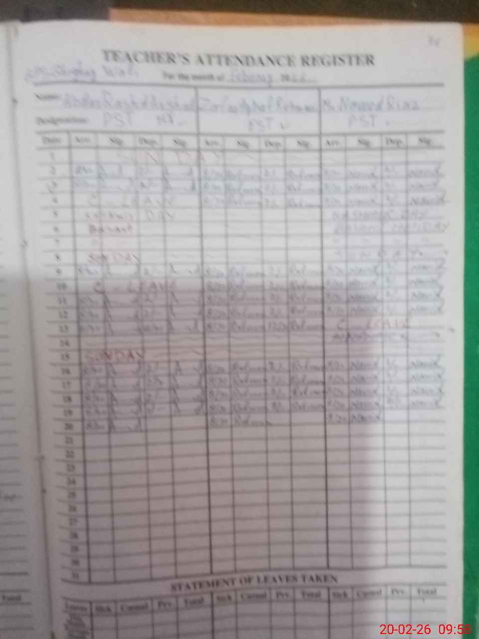 | CNIC | Full Name | Designation | R/C | Absence During Last Calender Month |