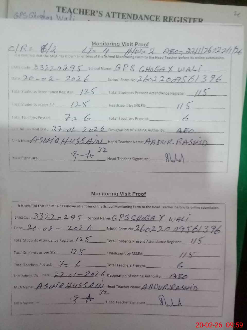 | Attendance Register | Head Teacher | MEA with School | Visit Proof |