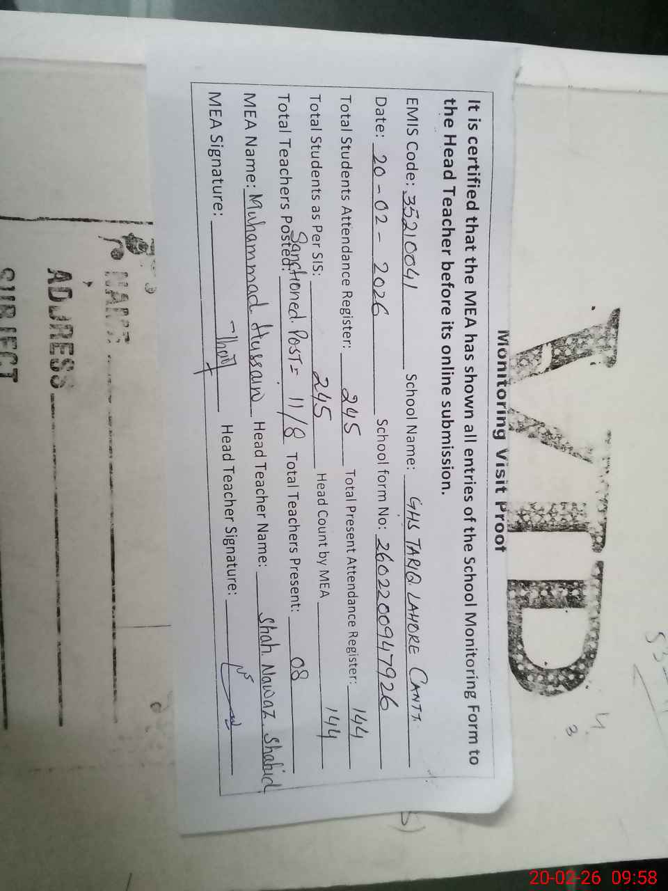 | EMIS Code: 35210041 | Name of School: GHS TARIQ LAHORE CANTT | |||