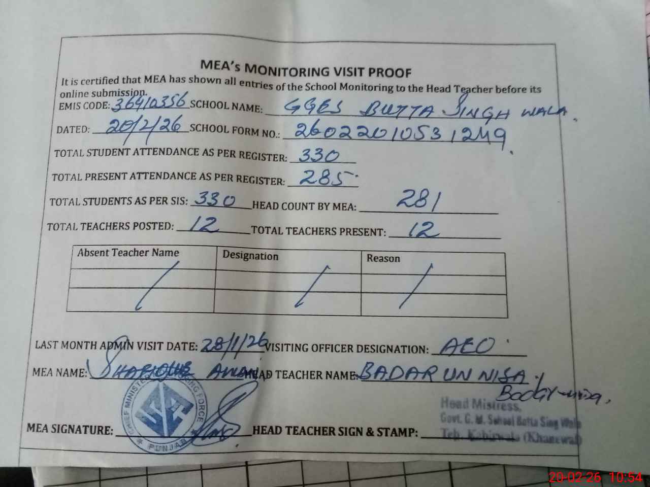 | Attendance Register | Head Teacher | MEA with School | Visit Proof |