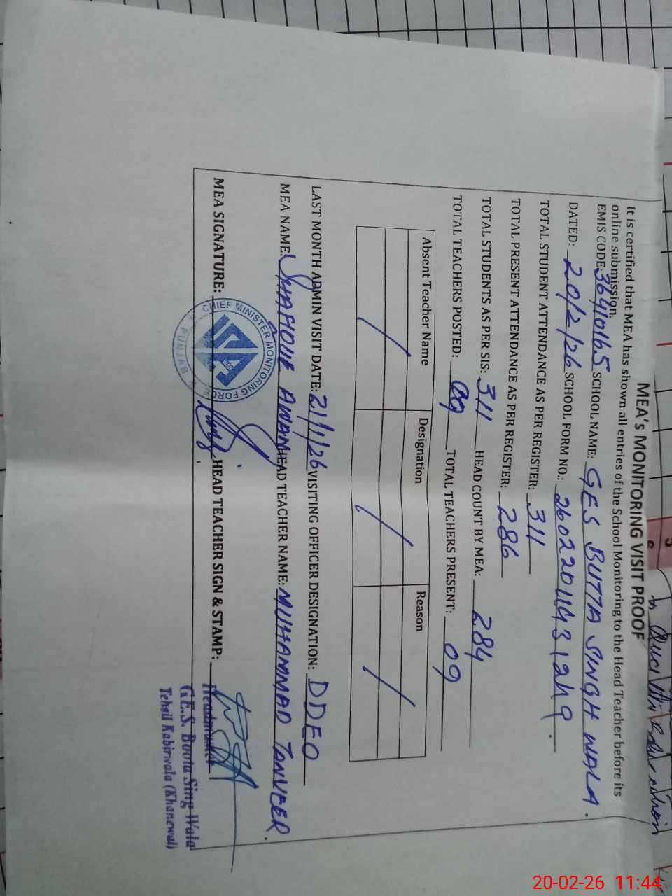 | Attendance Register | Head Teacher | MEA with School | Visit Proof |