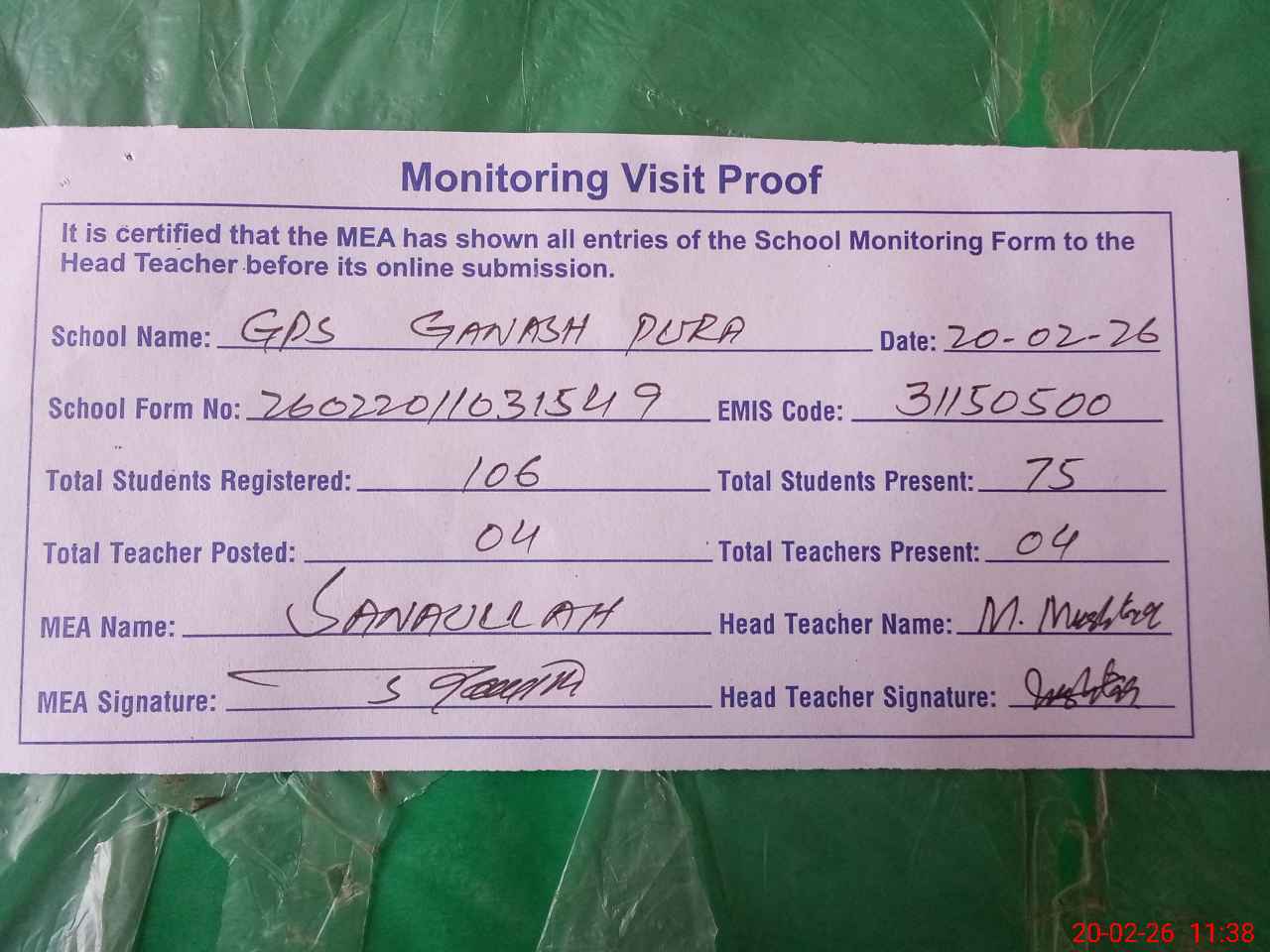 | EMIS Code: 31150500 | Name of School: GPS GANASH PURA MINCHINABAD | |||