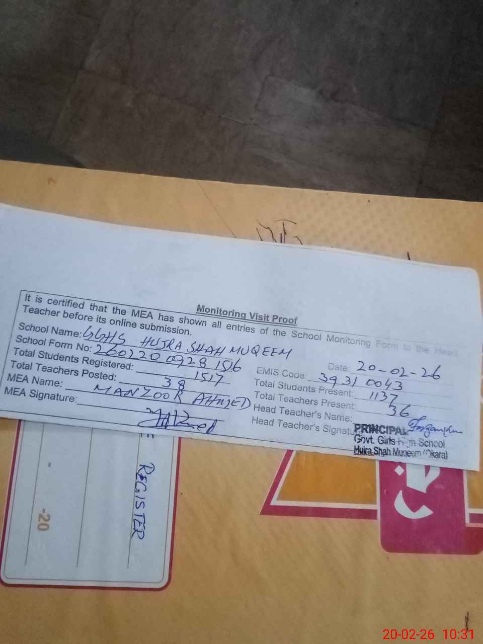 | EMIS Code: 39310043 | Name of School: GGHS HUJRA SHAH MUQEEM | |||