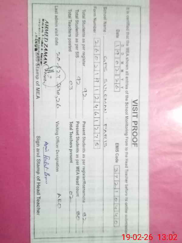 | EMIS Code: 37210440 | Name of School: GPS SULEMAN PARIS JHELUM | |||