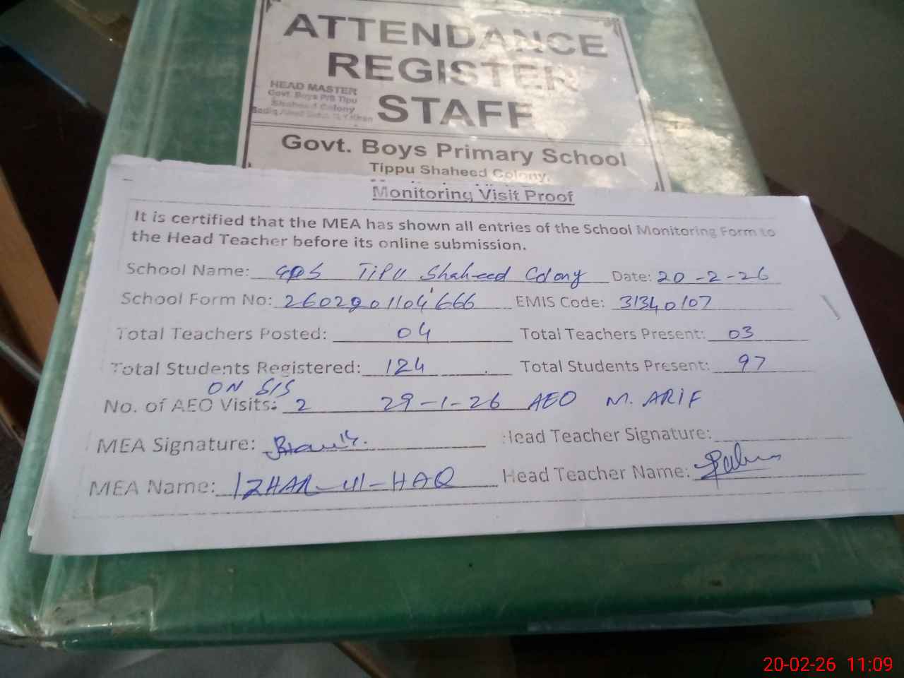 | Attendance Register | Head Teacher | MEA with School | Visit Proof |