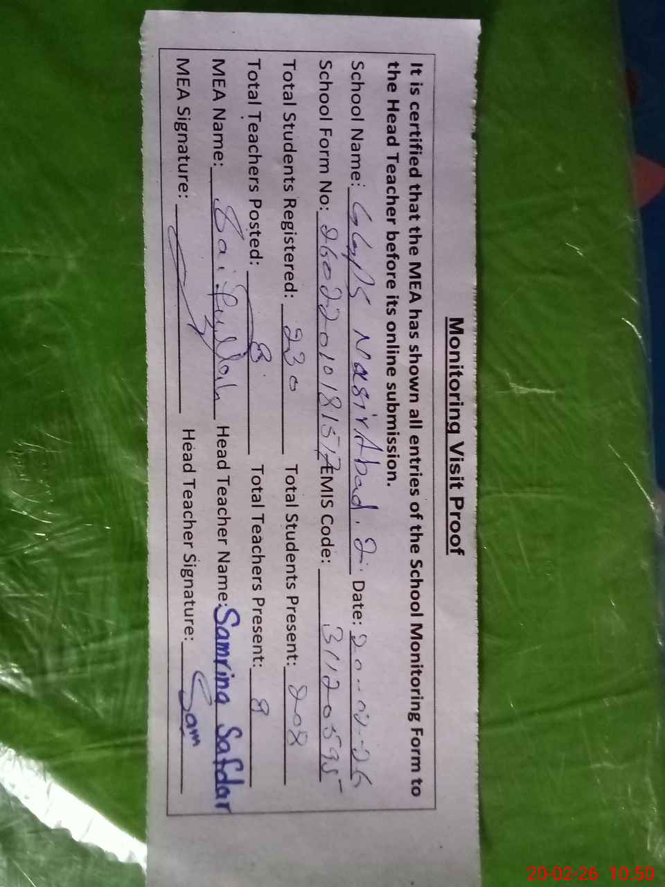 | Attendance Register | Head Teacher | MEA with School | Visit Proof |