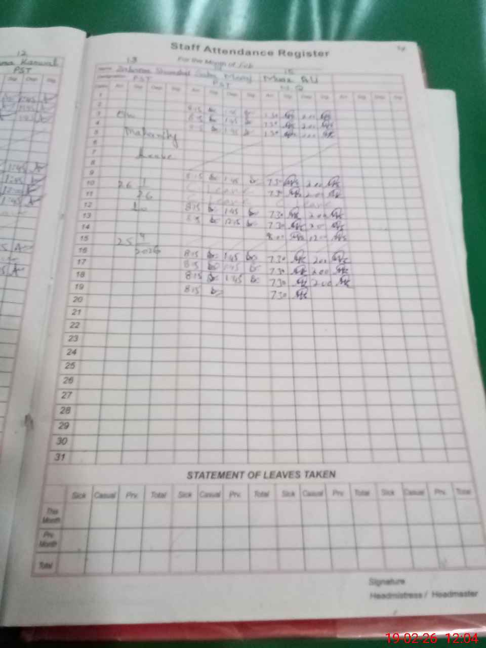 | 34**** | Za**** Sh**** | PST Arts | Regular | 0 | 0 | 0 | 0 | 0 | 0 | 0 | 0 | 0 | Maternity |