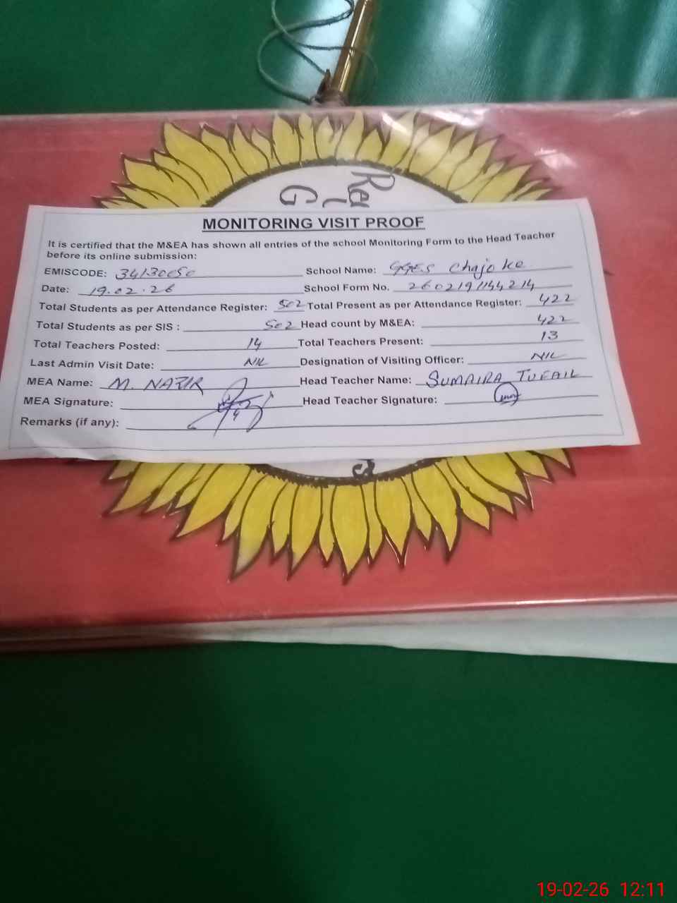 | Attendance Register | Head Teacher | MEA with School | Visit Proof |
