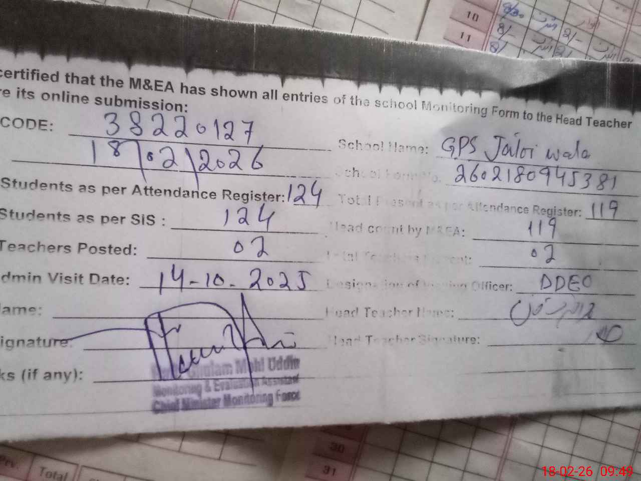 | Remarks (Use Separate Page if Required): last visit by DDEO 14 October 2025 | |||||