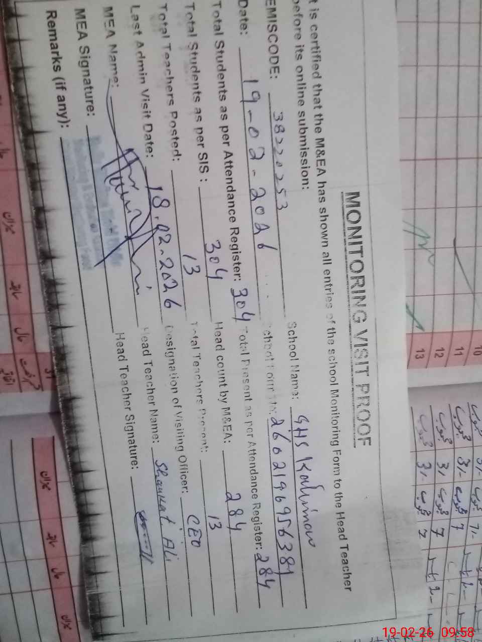 | Attendance Register | Head Teacher | MEA with School | Visit Proof |