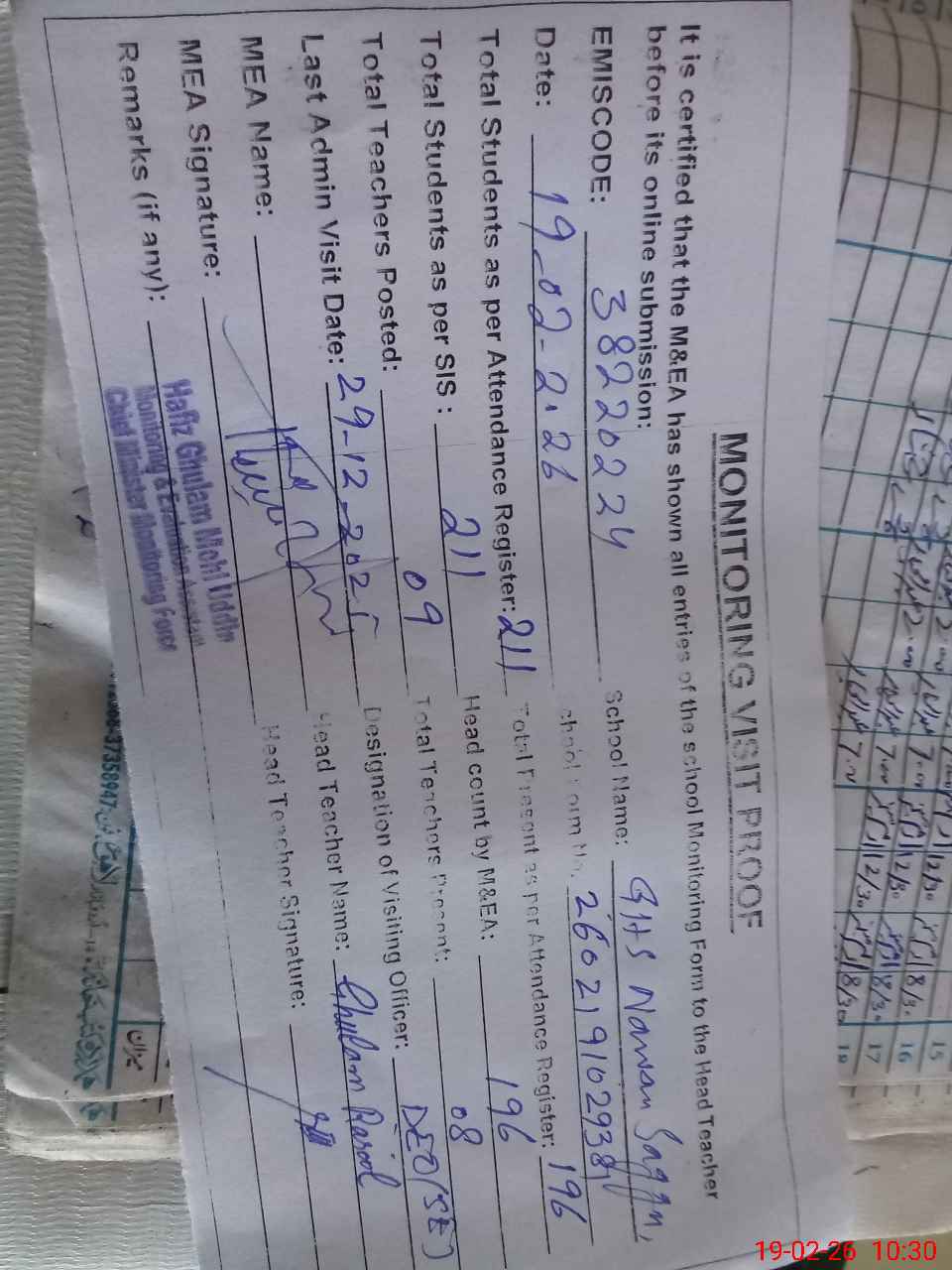 | Certified that this School was Inspected by the Undersigned MEA/DMO Today and the Information Stated Above is as Per Record. | |||||
