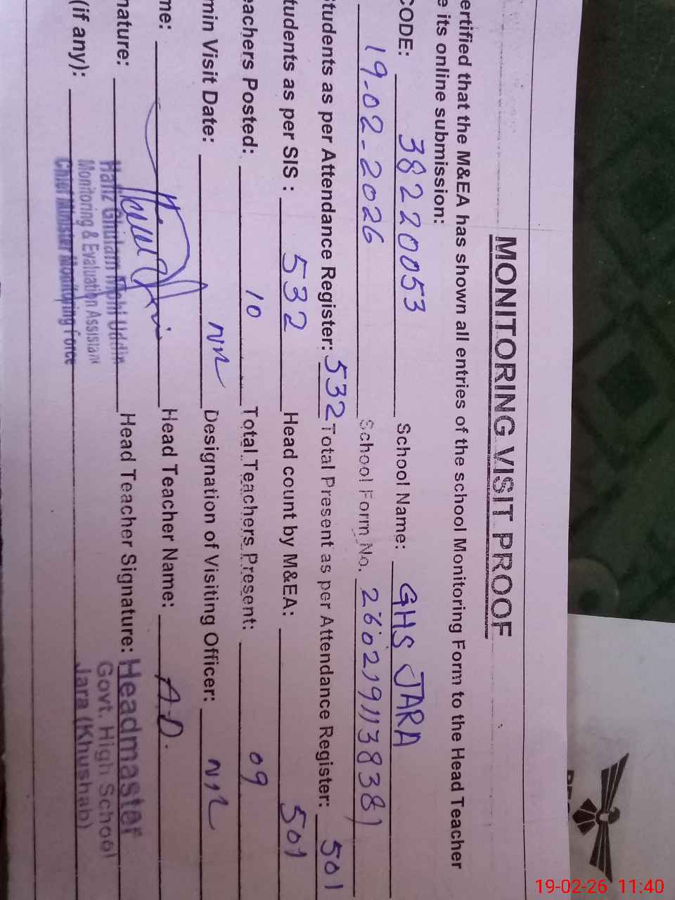 | Attendance Register | Head Teacher | MEA with School | Visit Proof |