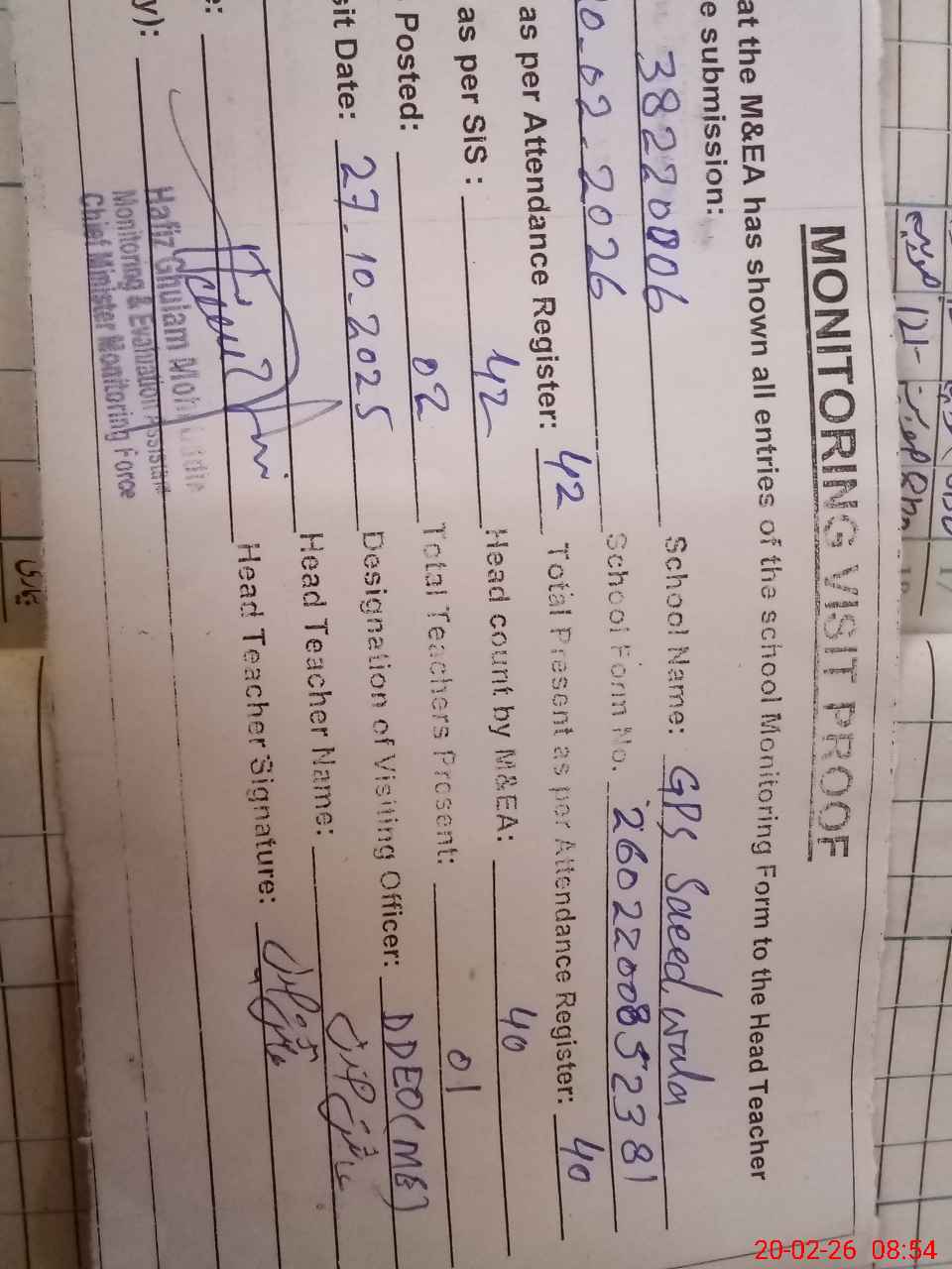 | EMIS Code: 38220006 | Name of School: GPS SAEED WALA | |||