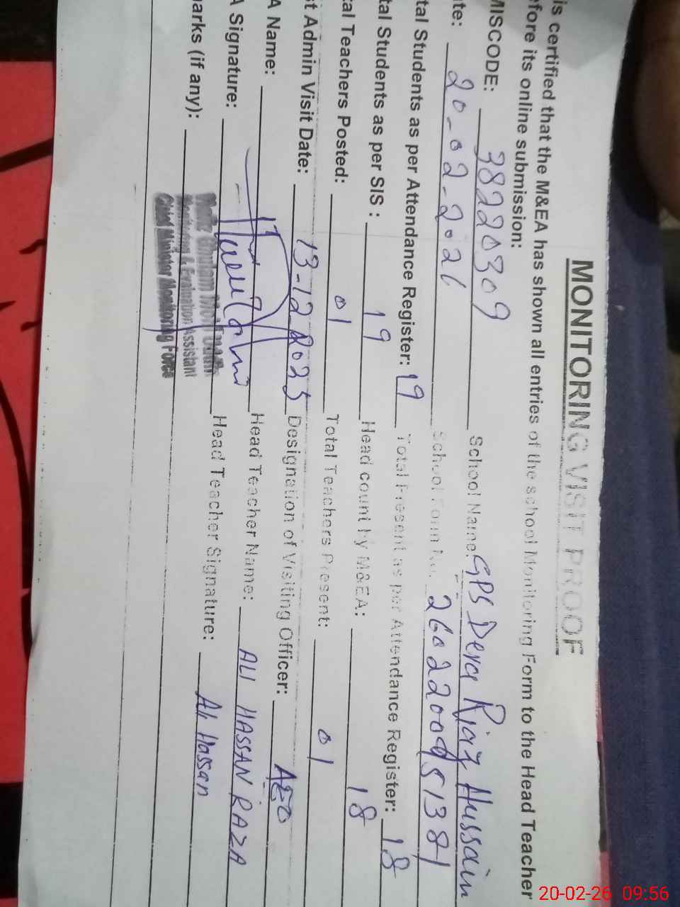 | EMIS Code: 38220309 | Name of School: GPS DERA RIAZ HUSSAIN SAAGU | |||