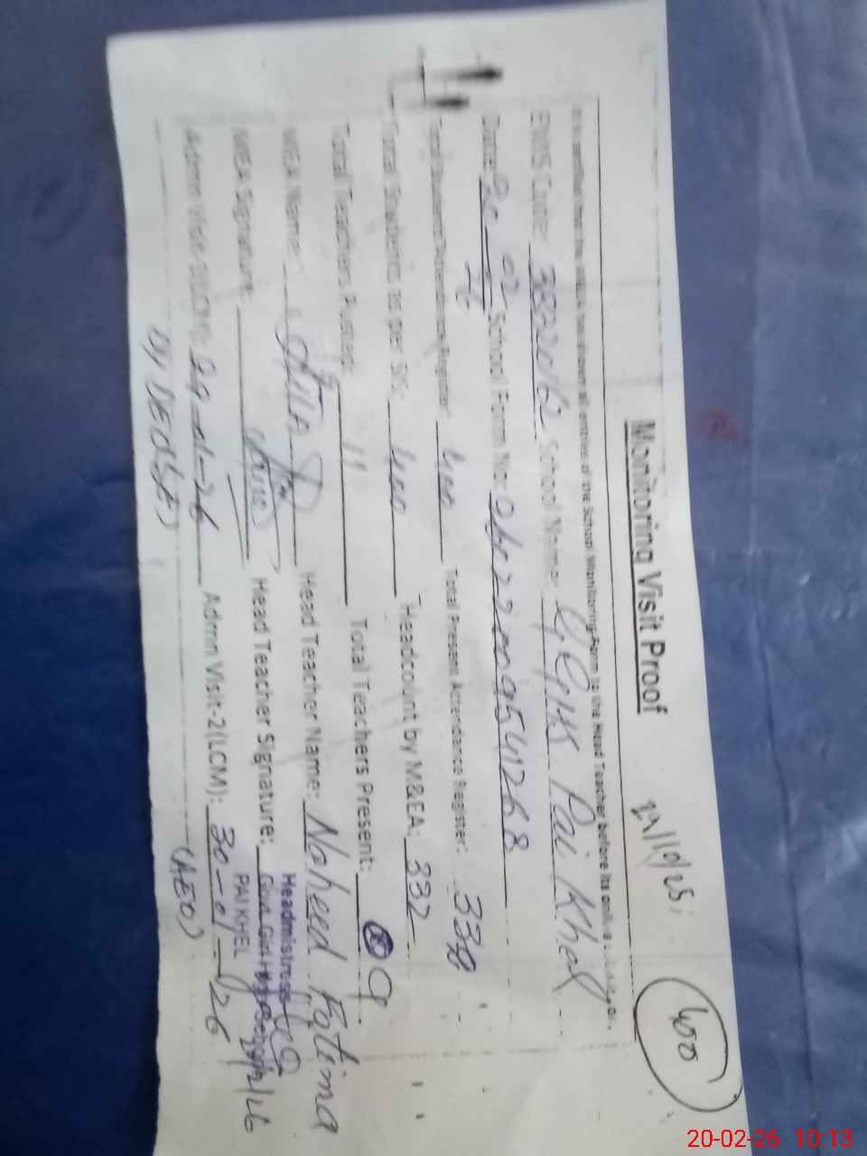 | Attendance Register | Head Teacher | MEA with School | Visit Proof |