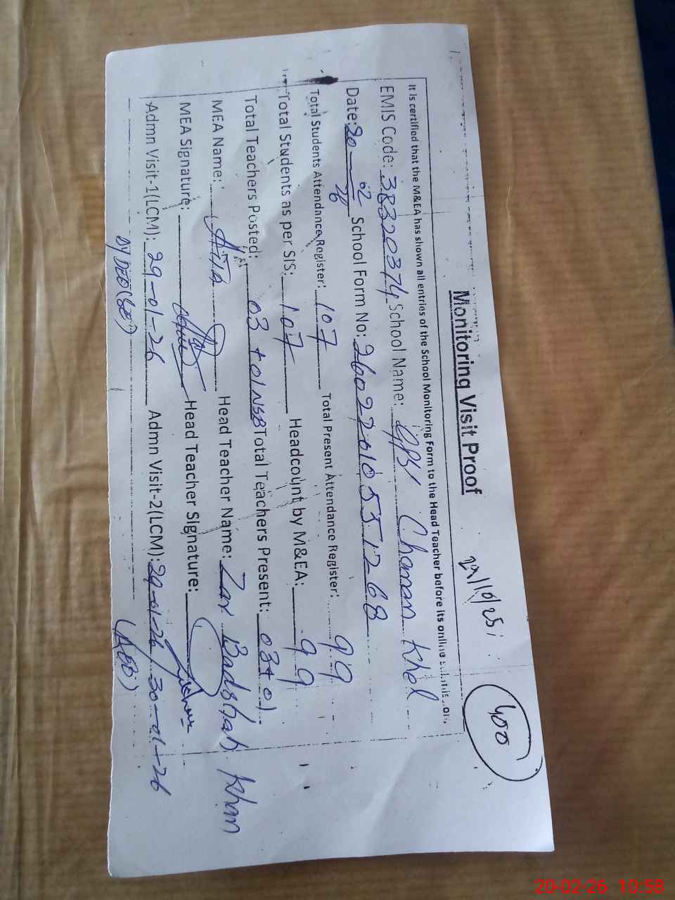 | Attendance Register | Head Teacher | MEA with School | Visit Proof |