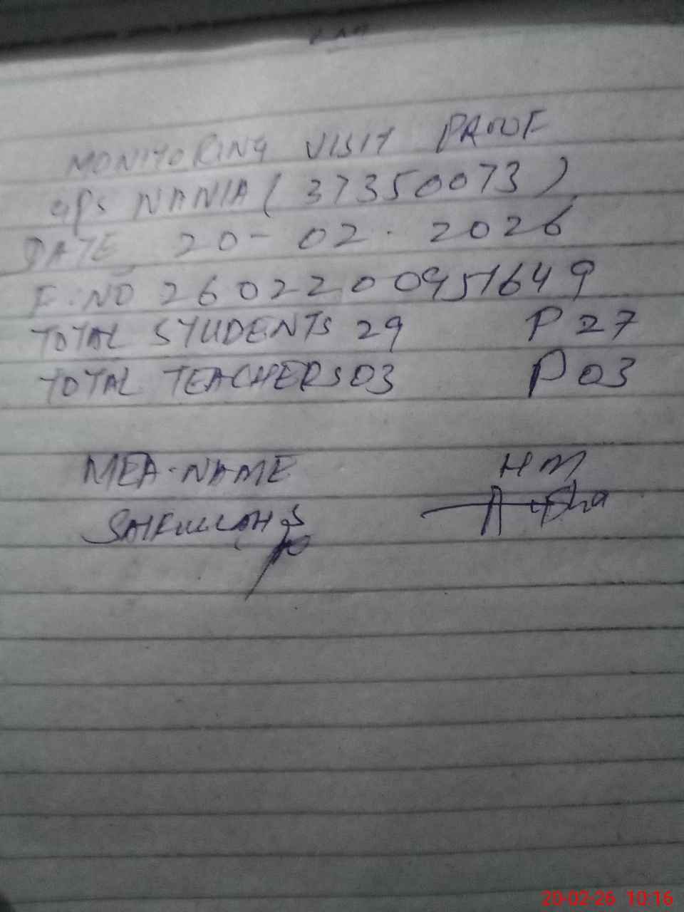 | Attendance Register | Head Teacher | MEA with School | Visit Proof |