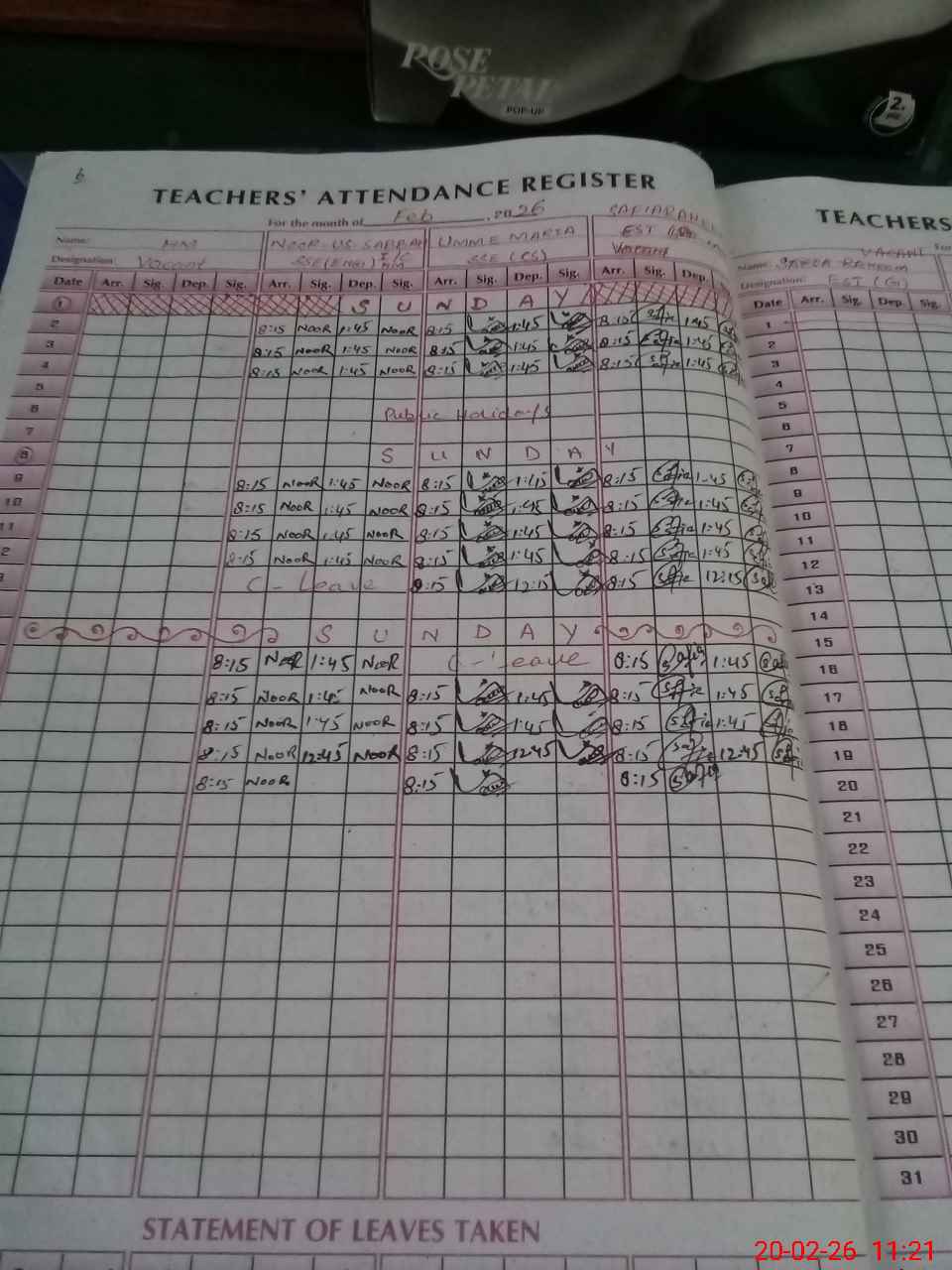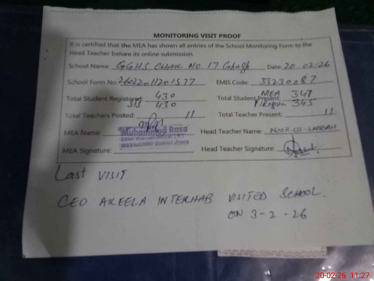 | Attendance Register | Head Teacher | MEA with School | Visit Proof |