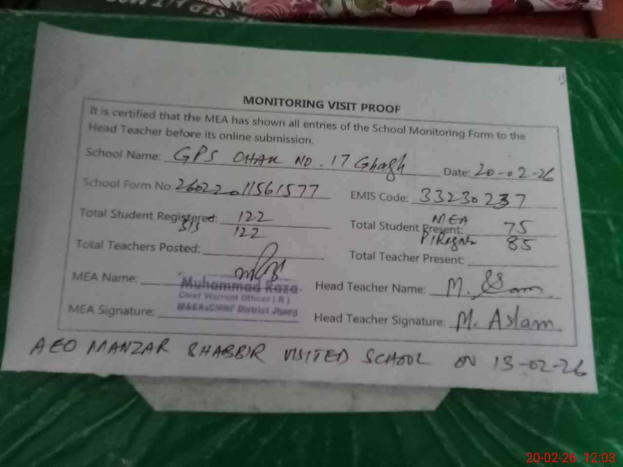 | EMIS Code: 33230237 | Name of School: GPS CHAK NO 17 GHAGH | |||