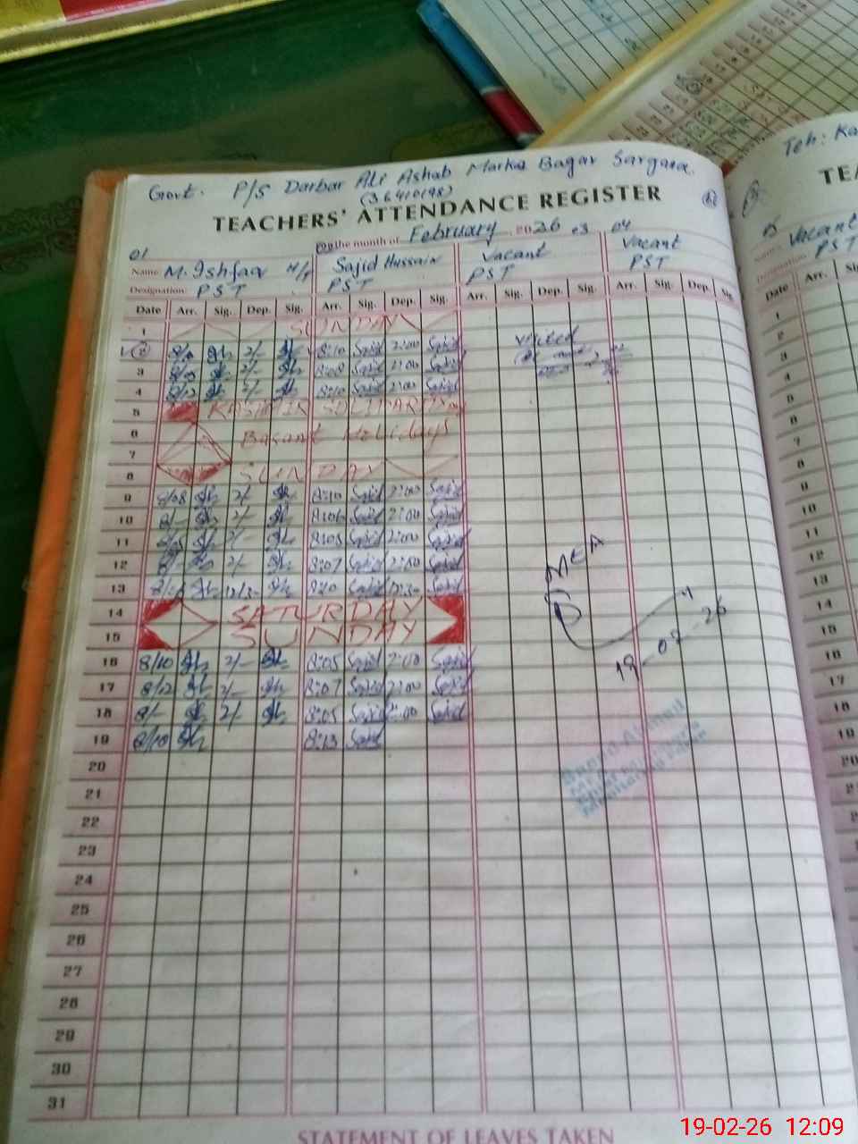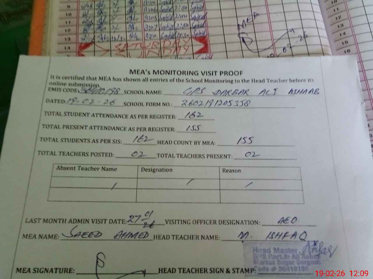 | Attendance Register | Head Teacher | MEA with School | Visit Proof |