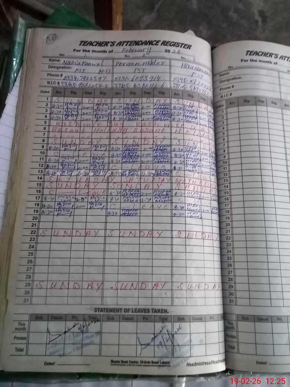 | CNIC | Full Name | Designation | R/C | Absence During Last Calender Month |